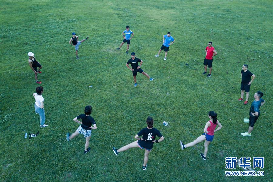 6月11日傍晚,在海口万绿园,市民在夜跑前做热身运动(无人机拍摄)。近年来,夜跑成为越来越多都市人热衷的健身方式之一。在海南海口,每当夜幕降临,“夜跑族”来到海口万绿园、世纪公园等夜跑场所跑步,用一身酣畅淋漓的汗水摆脱白天工作中的压力,享受跑步带来的欢愉。新华社记者 蒲晓旭 摄