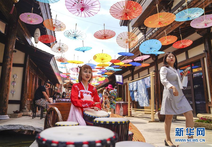 6月13日,在长春市世茂莲花山小镇宽厚里商街,一名古装爱好者演奏手鼓。当日是“文化和自然遗产日”。吉林长春首届莲花山消夏生活节在世茂莲花山小镇举行。活动将非遗展示与假日消暑休闲相结合,让游人在“古色古香”的油纸伞巷中品传统文化魅力,享夏日休闲惬意。新华社记者许畅摄。
