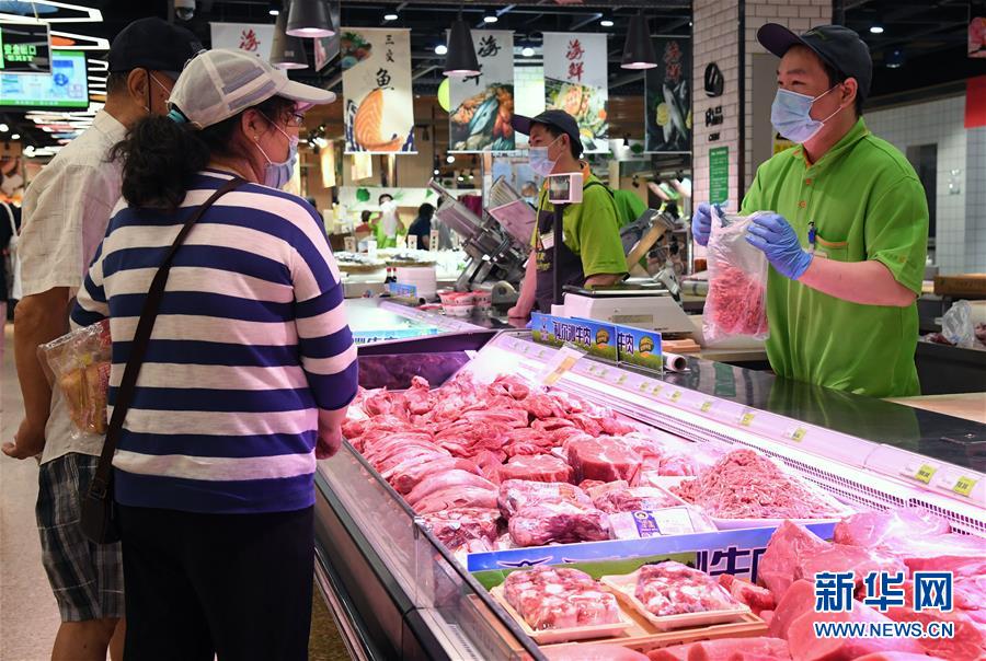 6月14日,在北京市海淀区的超市发双榆树店,市民在挑选鲜肉。 新华社记者 任超 摄