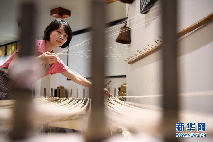 6月12日,在重庆荣昌的天运夏布会馆,非遗传承人马琳沁在展示传统夏布生产工艺——牵线。新华社记者 唐奕 摄