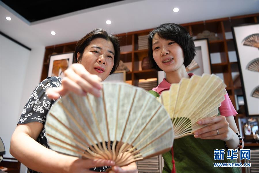 6月12日,非遗传承人马仁芬(左)与马琳沁在探讨夏布折扇的设计。新华社记者 唐奕 摄