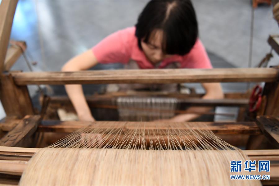 6月12日,在重庆荣昌的天运夏布会馆,非遗传承人马琳沁在用织布机织造荣昌夏布。新华社记者 唐奕 摄