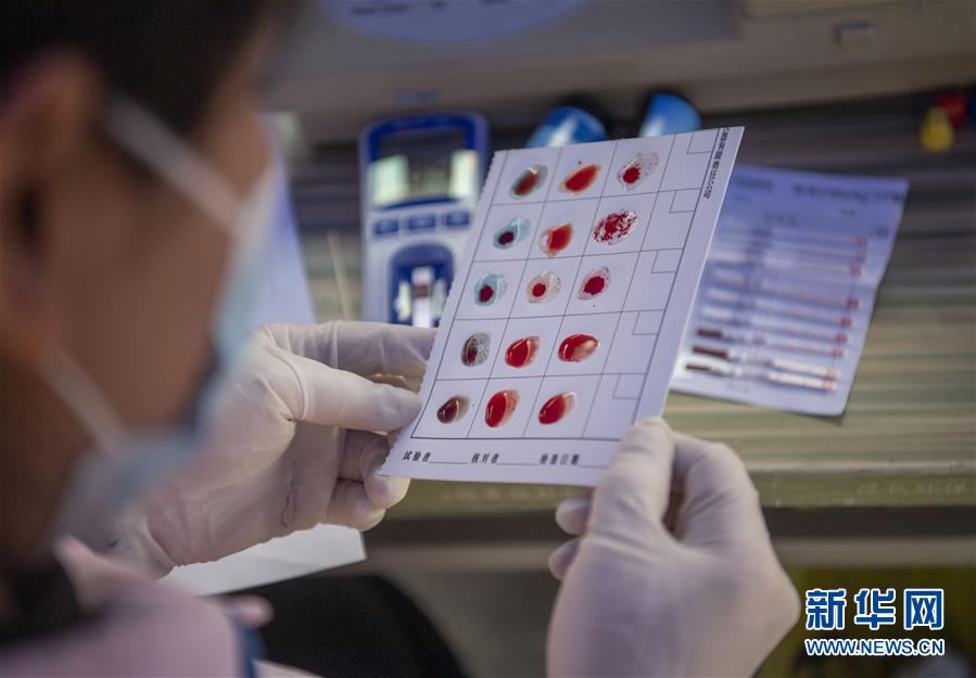 6月14日,在拉萨市宇拓路的献血点,西藏自治区血液中心的工作人员在给献血者的血液样本进行血型检测。当日是世界献血者日。为宣传无偿献血相关知识、传播无偿献血公益理念,世界献血者日宣传和采血活动在拉萨市举办。新华社记者 孙非 摄