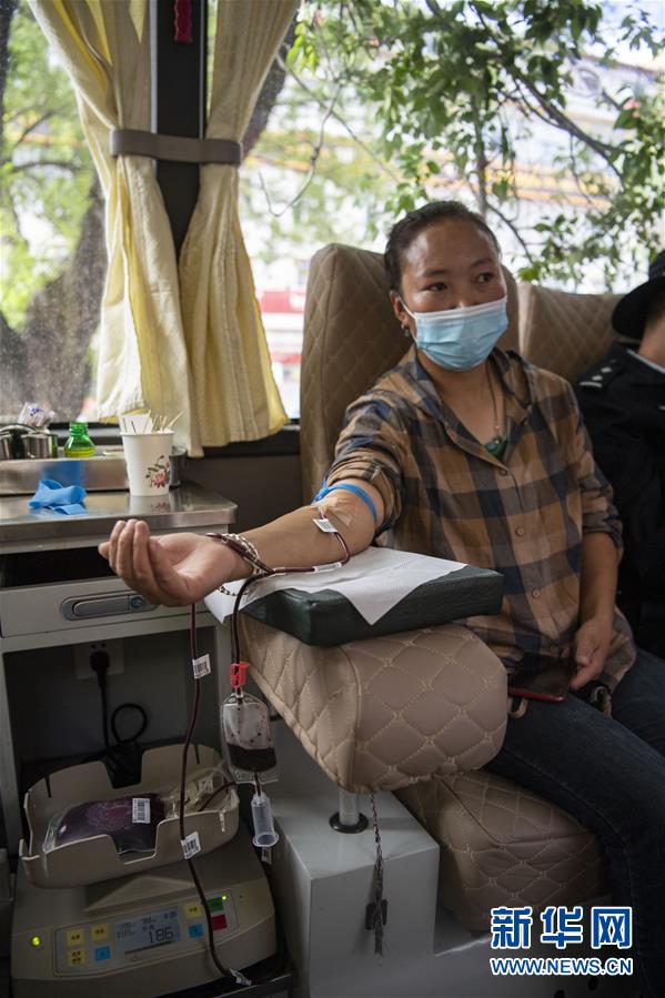 6月14日,在拉萨市宇拓路的献血点,久美卓玛在献血。当日是世界献血者日。为宣传无偿献血相关知识、传播无偿献血公益理念,世界献血者日宣传和采血活动在拉萨市举办。新华社记者 孙非 摄
