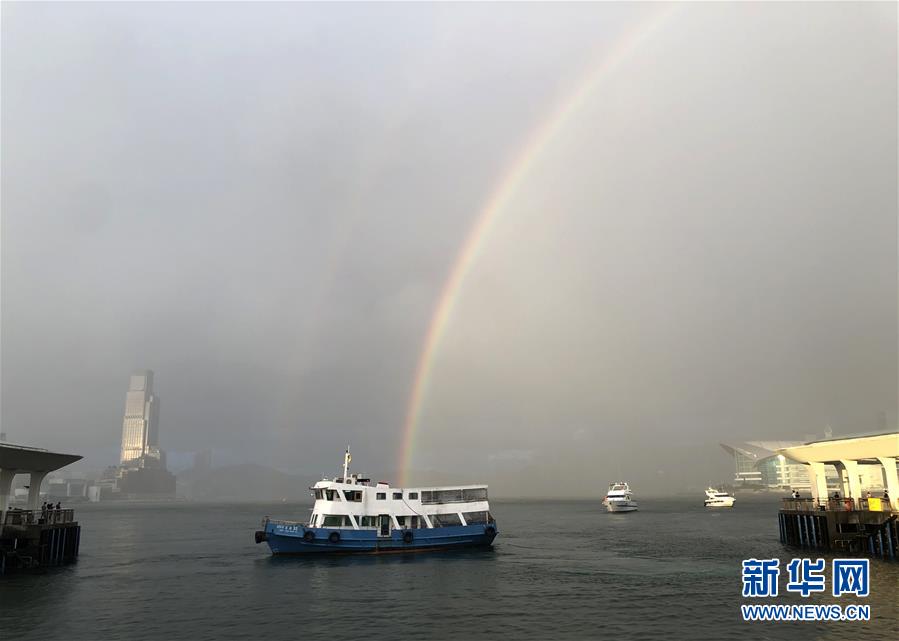 香港维多利亚港上空出现彩虹(6月16日摄)。6月16日傍晚,雨后的香港维多利亚港上空出现彩虹,美丽景色吸引市民驻足拍照。新华社记者 李钢 摄