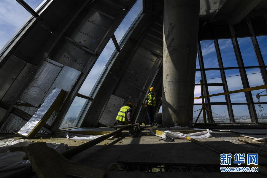 6月16日,工人在新疆乌鲁木齐奥林匹克体育中心运动员宾馆内施工。新华社记者 王菲 摄