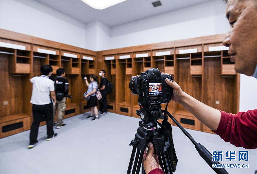 6月16日,在新疆乌鲁木齐奥林匹克体育中心综合体育馆内,媒体从业者在拍摄运动员更衣室。新华社记者 王菲 摄
