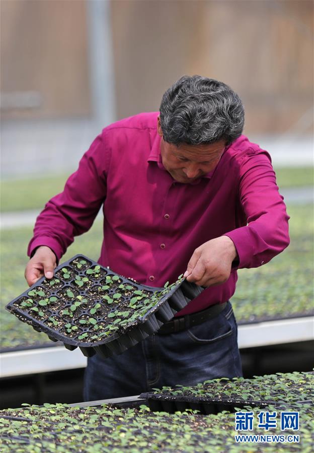 在辽宁省盘锦市大洼区新兴镇坨子里村,刘广会在自己经营的育苗企业内查看蔬菜种苗生长情况(6月9日摄)。新华社记者 杨青 摄