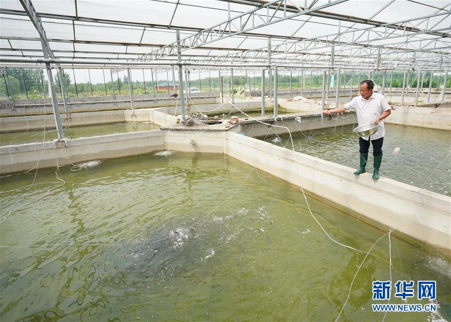 6月16日,在卢龙县印庄乡榆林甸村永新水产养殖专业合作社的养殖基地,养殖户刘玉永在给淡水鲈鱼投放饲料。