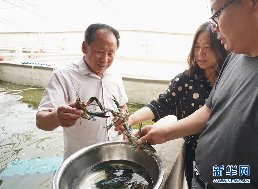 6月16日,在卢龙县印庄乡榆林甸村永新水产养殖专业合作社的养殖基地,养殖户刘玉永(左)与河北省海洋与水产科学研究院科研人员探讨澳洲淡水龙虾养殖技术。新华社记者 杨世尧 摄