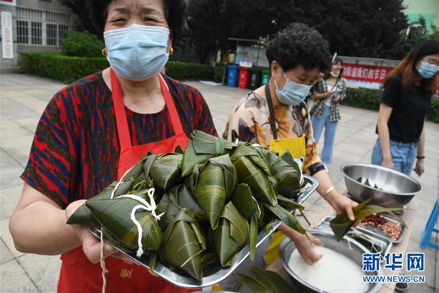 6月17日,水清沟街道居民在社区广场上包粽子。新华社记者 李紫恒 摄