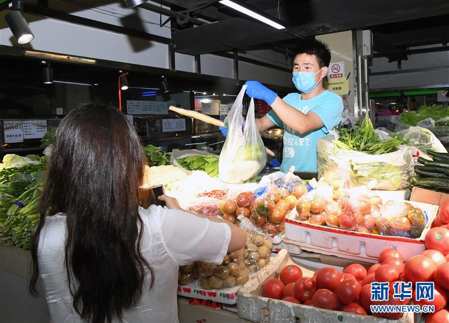 6月17日,在位于北京市海淀区的增光鸿运市场,市民(左)在购买蔬菜。新华社记者 任超 摄