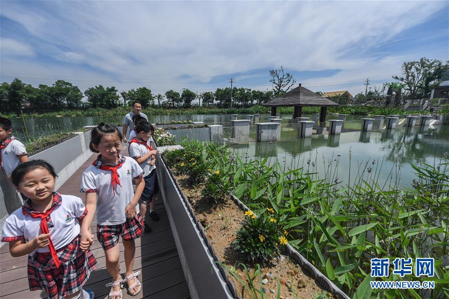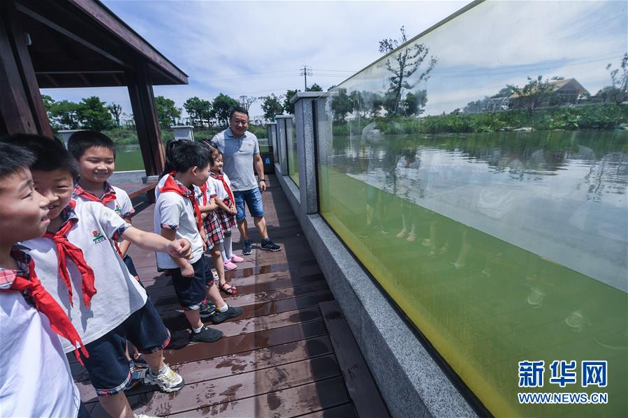 6月17日,洛舍镇中心学校的师生们参观水情馆的室外园区。新华社记者 徐昱 摄