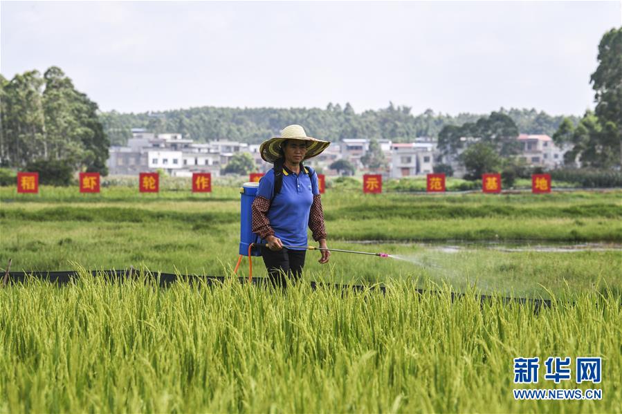 6月17日,在广西武宣县禄新镇上堂村稻虾轮作养殖示范基地,村民在给水稻施肥。新华社记者 曹祎铭 摄