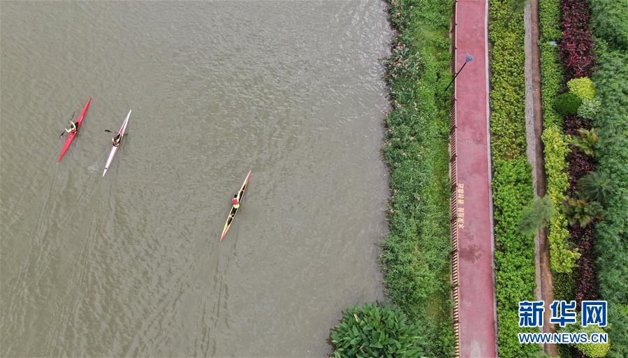 6月15日,划艇运动员在茅洲河上训练(无人机照片)。新华社记者 邓华 摄