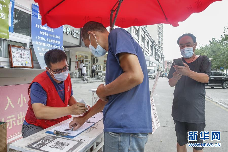 6月17日,人们在北京市西城区广外街道小马厂东社区的入口登记信息。新华社记者 张玉薇 摄