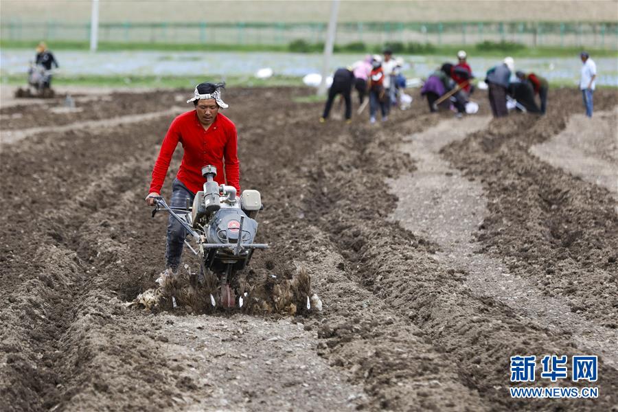 在四川省阿坝藏族羌族自治州壤塘县尕多乡瑟谷村热不卡小组,村民尚壤扶着微耕机在蔬菜基地里耕地(6月13日摄)。新华社记者 沈伯韩 摄