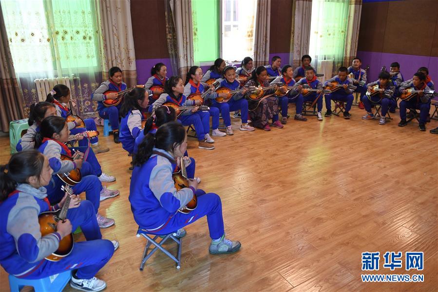 6月14日,孩子们在阿坝县民族寄宿制小学内的少年宫里用曼陀铃进行弹唱。新华社记者 刘坤 摄