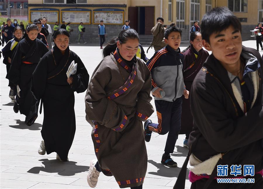 6月14日,阿坝县藏文中学学生午休后步入教室准备上课。新华社记者 刘坤 摄