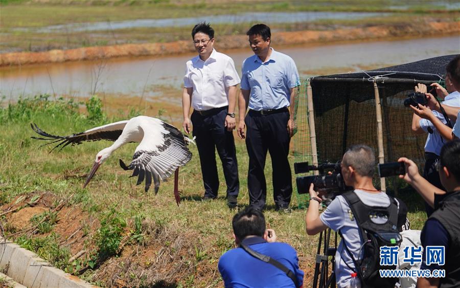 当日,江西省林科院野生动植物救护中心在万年县鄱阳湖畔放飞三只被救助的东方白鹳。