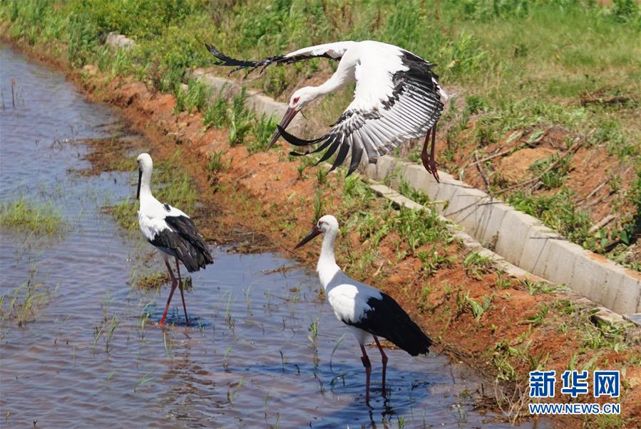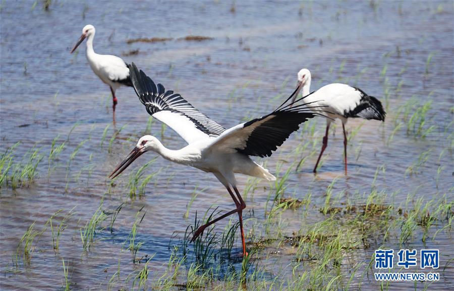6月17日,放归自然的三只东方白鹳在觅食。新华社记者 周密 摄