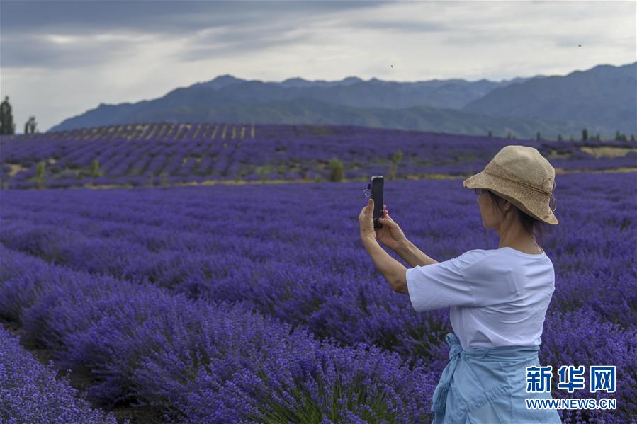 游客在霍城县芦草沟镇四宫村的一处薰衣草花田里拍照留念(6月16日摄)。新华社记者 赵戈 摄