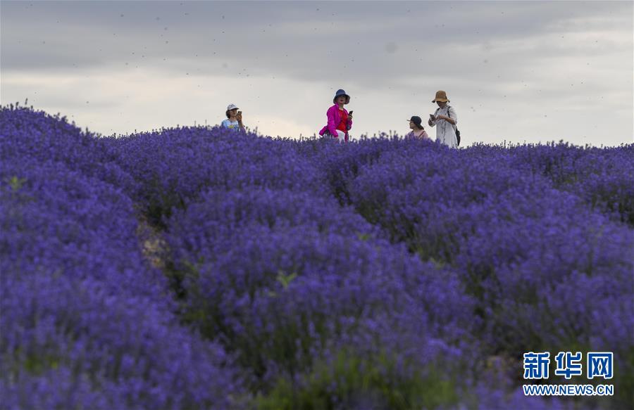 游客在霍城县芦草沟镇四宫村的一处薰衣草花田里游玩(6月16日摄)。新华社记者 赵戈 摄