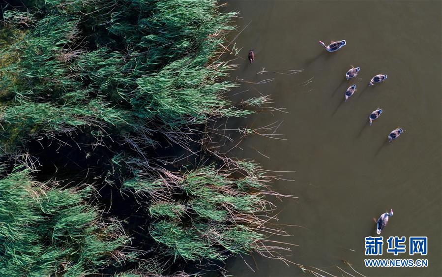 6月19日,一群鸭子在新疆乌伦古湖国家湿地公园觅食(无人机照片)。乌伦古湖国家湿地公园位于新疆阿勒泰地区福海县城以西,由乌伦古湖和吉力湖两部分组成。乌伦古湖湿地公园是迁徙候鸟飞越天山和阿尔泰山的“能量补充站”,良好的湿地生态吸引着大量迁徙鸟类在此集结成群,繁殖栖息,成为一道靓丽的风景线。新华社记者 沙达提 摄
