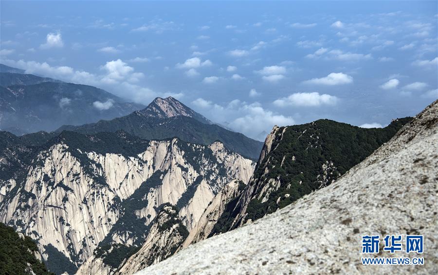 6月18日,白云飘动下的华山。当日,西岳华山经历连续三天暴雨后,迎来灿烂的阳光。新华社记者 陶明 摄