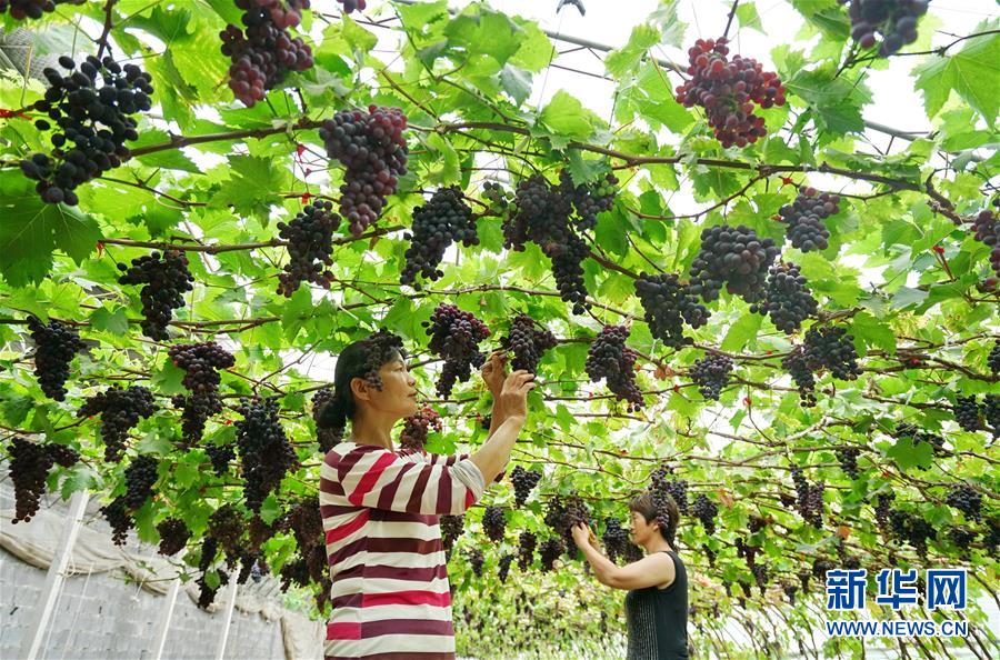 6月21日,滦州市雷庄镇吉祥现代农业园区的员工在打理种植的葡萄。近年来,河北省滦州市积极调整农业产业结构,鼓励当地合作社和农户发展果蔬种植,丰富当地农产品种类,越来越多的农民依靠“果园子”“菜篮子”鼓起了“钱袋子”。新华社记者牟宇摄