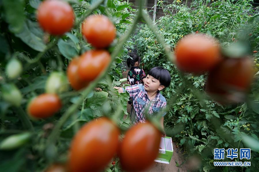 6月21日,小朋友在滦州市雷庄镇吉祥现代农业园区大棚内采摘樱桃西红柿。近年来,河北省滦州市积极调整农业产业结构,鼓励当地合作社和农户发展果蔬种植,丰富当地农产品种类,越来越多的农民依靠“果园子”“菜篮子”鼓起了“钱袋子”。新华社记者牟宇摄