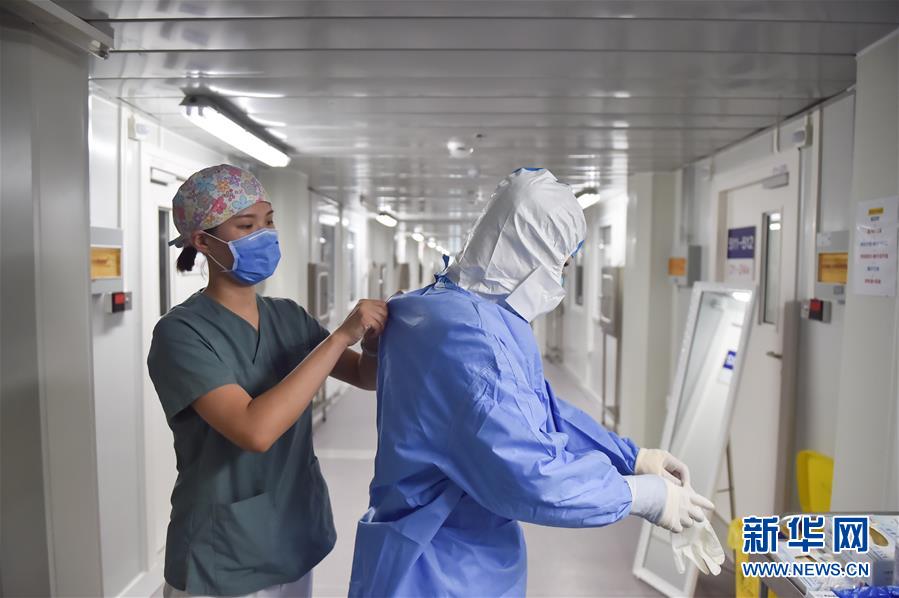 6月19日,在北京地坛医院隔离病房外,一名护士在帮同事穿防护服。新华社记者彭子洋摄