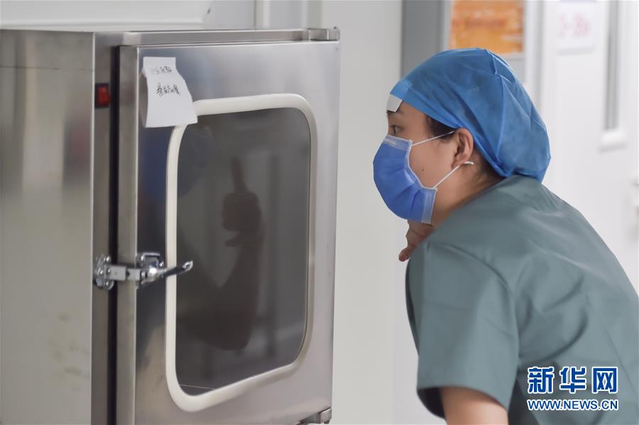 6月19日,在北京地坛医院隔离病房外,护士和病人沟通,做着打电话的手势。新华社记者彭子洋摄