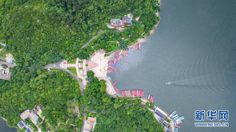 6月21日,游客乘船在红枫湖景区游览(无人机照片)。夏至时节,贵州省清镇市红枫湖景区草木苍翠,秀丽的湖光山色吸引不少游客前来游玩。新华社记者陶亮摄