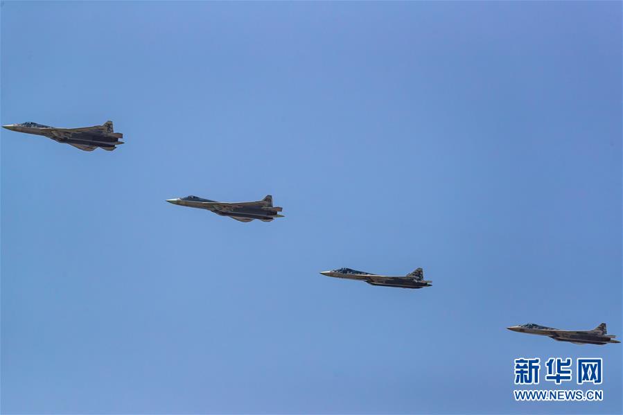 6月20日,在俄罗斯首都莫斯科,苏-57战斗机编队参加阅兵式彩排。俄罗斯将于6月24日举行纪念卫国战争胜利75周年阅兵式。新华社记者白雪骐摄