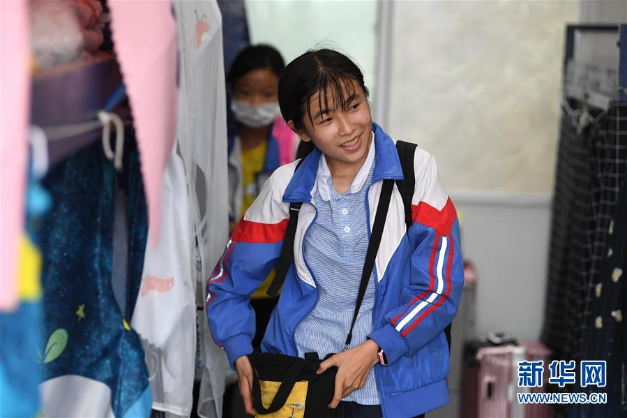 6月19日,在金寨县三合实验学校宿舍,蔡齐艳放学后收拾行李准备回家过周末。新华社记者刘军喜摄