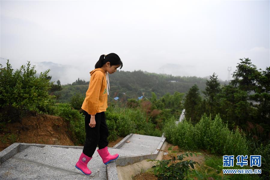 6月20日,蔡齐艳在山顶玩耍。高湾村新修了旅游观光步道,以发展旅游脱贫项目。新华社记者刘军喜摄