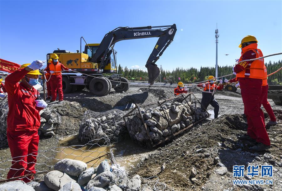 6月22日,应急抢险队员参加演练。当日,新疆维吾尔自治区公路管理局组织的2020年国省干线公路突发地质灾害应急演练在乌鲁木齐举行,演练模拟乌鲁木齐市柴窝堡区域遭受强降雨,诱发附近水域突发洪水,公路路基面临被洪水冲毁的险情,组织抢险人员和机械设备在指定时间内赶赴受灾现场实施应急抢险处置。此次演练将进一步增强各相关部门的防灾减灾意识,提高公路应急抢险处突能力。新华社记者王菲摄