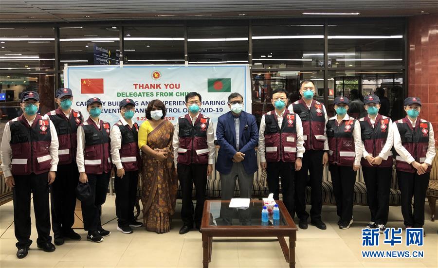 6月22日,孟加拉国卫生和家庭福利部部长马利克(右六)等在首都达卡举行的送行仪式上与中方专家组合影留念。中国赴孟加拉国抗疫医疗专家组圆满完成任务,于22日乘机返回祖国。孟加拉国卫生和家庭福利部部长马利克对疫情发生以来中国给予孟加拉国的大力支持表示感谢。新华社记者刘春涛摄