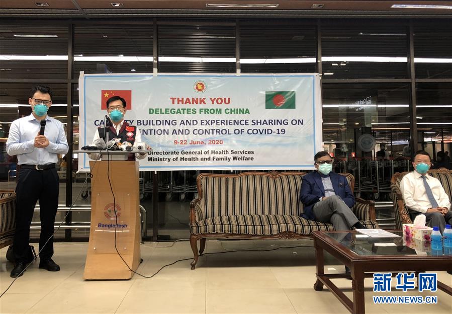 6月22日,中国赴孟加拉国抗疫医疗专家组领队李文秀(左二)在孟加拉国首都达卡举行的送行仪式上致辞。中国赴孟加拉国抗疫医疗专家组圆满完成任务,于22日乘机返回祖国。孟加拉国卫生和家庭福利部部长马利克对疫情发生以来中国给予孟加拉国的大力支持表示感谢。新华社记者刘春涛摄