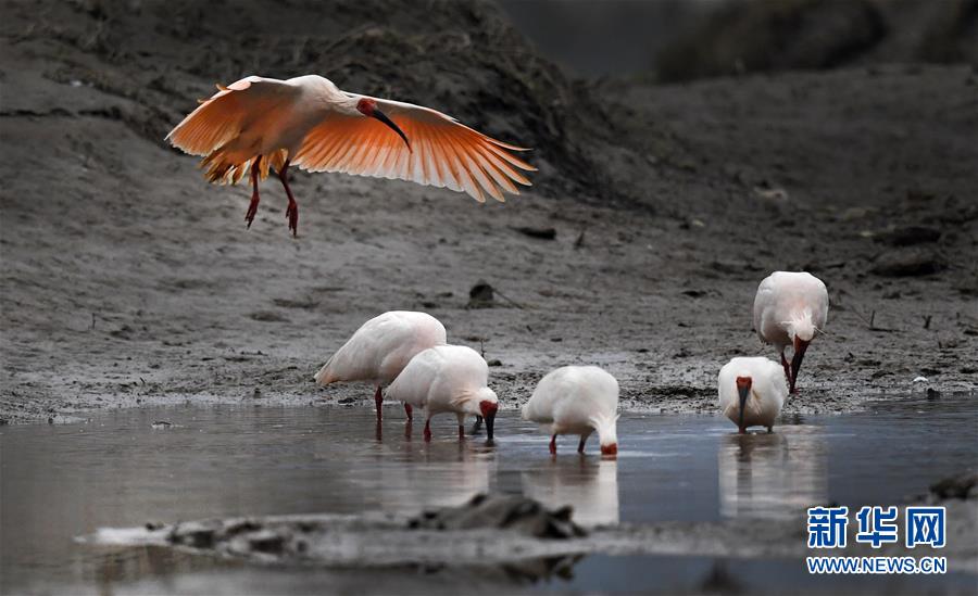 朱鹮在陕西省汉中市西乡县峡口镇井坝村牧马河觅食(2019年11月19日摄)。记者22日从陕西省林业局了解到,据不完全统计,曾几近灭绝的朱鹮,其全球种群数量已超过5000只,其中中国境内4400只,栖息地呈现出以秦岭为中心向东亚历史分布地扩展的趋势。新华社记者陶明摄