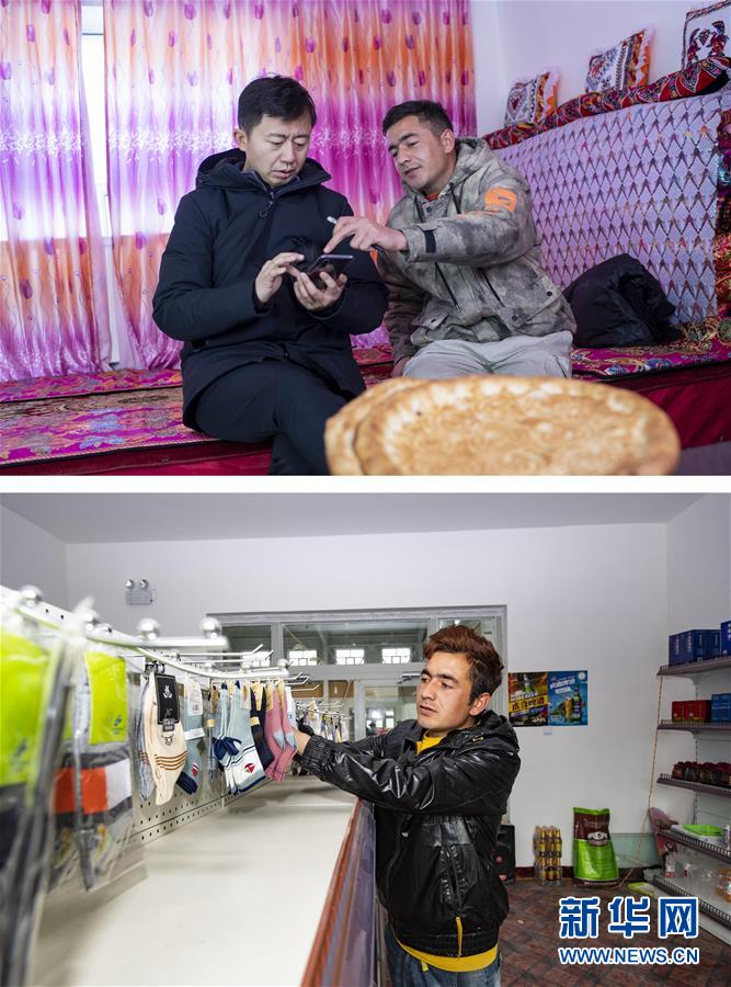 拼版照片:上图为新疆塔什库尔干塔吉克自治县扶贫工作人员付超(左)向都热·加尔曼的小儿子征求就业创业意愿(2019年11月25日摄);下图为都热·加尔曼的小儿子通过小额贷款在易地扶贫搬迁安置点开办了小商店(6月2日摄)。新华社记者胡虎虎摄