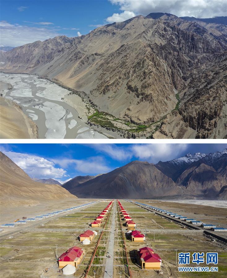 拼版照片:上图为新疆塔什库尔干塔吉克自治县热斯喀木村易地扶贫搬迁前一处散居的居住点(2019年7月8日摄,无人机照片);下图为实施易地扶贫搬迁后的热斯喀木村新貌(6月6日摄,无人机照片)。新华社记者胡虎虎摄