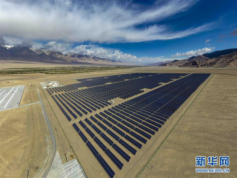 深圳援建的新疆塔什库尔干塔吉克自治县2万千瓦太阳能光伏扶贫电站(6月15日摄,无人机照片)。新华社记者胡虎虎摄
