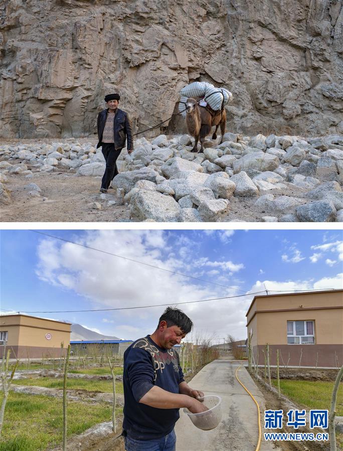 拼版照片:上图为新疆塔什库尔干塔吉克自治县大同乡村民都热·加尔曼牵着驮有搬迁行李的骆驼,走在山谷中(2018年11月17日摄);下图为都热·加尔曼在易地扶贫搬迁安置点准备播撒草籽(6月3日摄)。新华社记者胡虎虎摄
