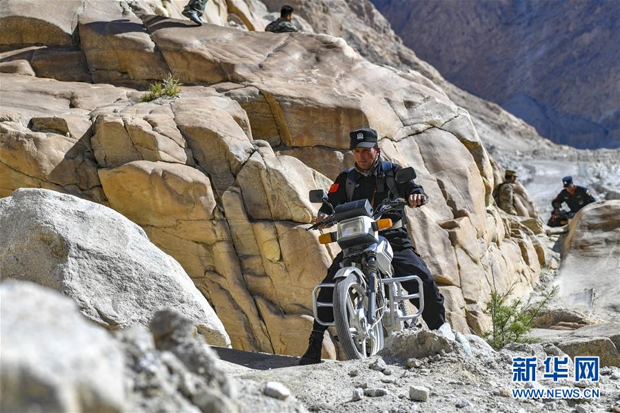 新疆塔什库尔干塔吉克自治县热斯喀木村护边员其拉克·买买热依木(前)骑摩托车巡逻(2019年7月5日摄)。新华社记者胡虎虎摄