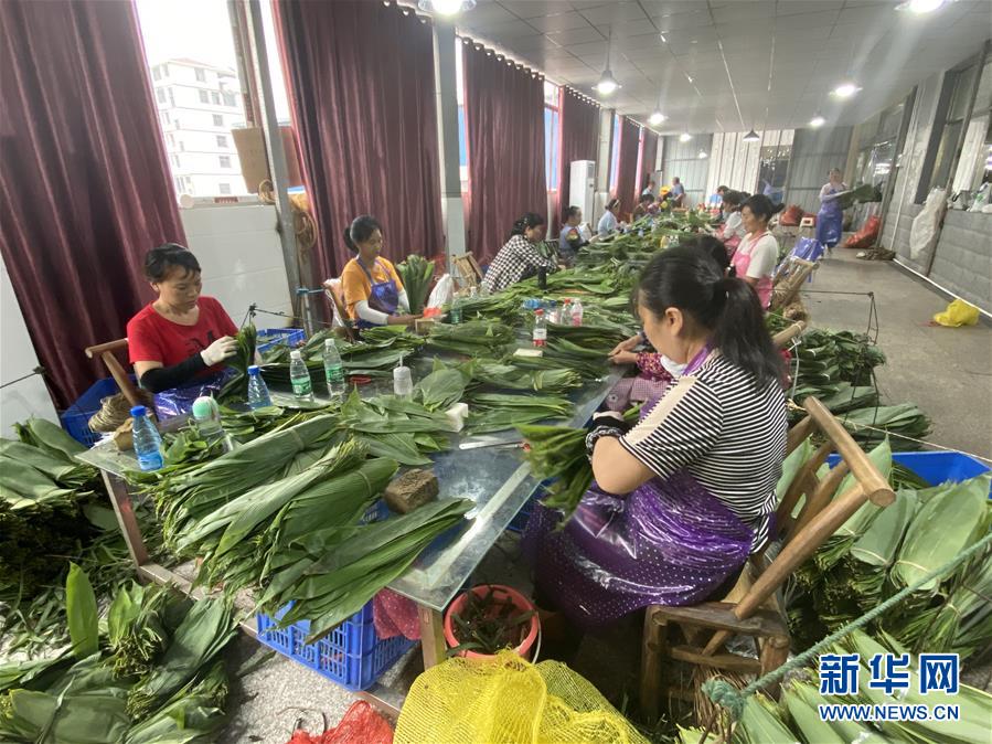 6月16日,桑植金桥农产品有限责任公司的员工对粽叶进行选叶、分级。新华社记者阮周围摄