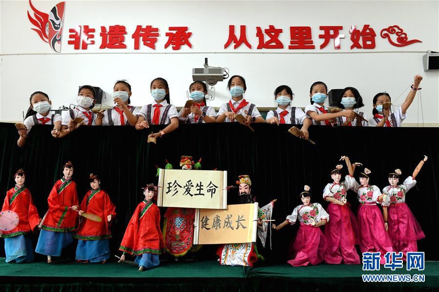 6月22日,连城县实验小学学生展演连城提线木偶戏,开展禁毒宣传活动。在“6·26”国际禁毒日来临之际,福建省连城县城乡小学学生将提线木偶、雕版印刷及传统花灯等当地客家非遗文化元素,融入校园禁毒宣传活动中,提高防毒、拒毒和禁毒意识。新华社记者彭张青摄