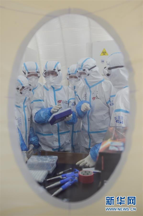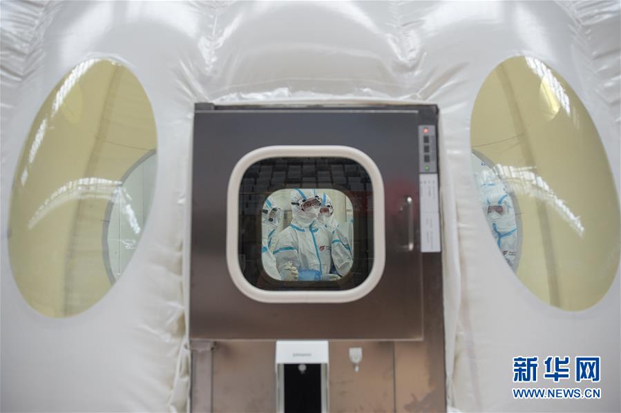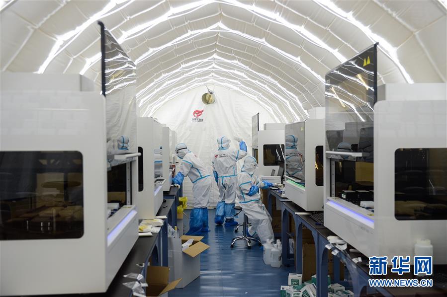 出于北京市疫情防控工作的需要,北京大兴区体育中心综合馆内正在搭建一个可移动、自动化、大通量的核酸检测实验室。目前,工人们正在紧张地进行设备安装和调试。据介绍,气膜版“火眼”核酸检测实验室6月19日下午开始搭建。两天多时间基本上完成了设备安装和调试。9个高3.5米、占地70多平方米的拱形白色气膜舱已搭建完毕,14台自动化核酸提取设备准备就绪。这个北京首座气膜版“火眼”核酸检测实验室正式运转后,实验室核酸检测能力可达到每天上万人份,缓解当前核酸检测压力。新华社记者彭子洋摄