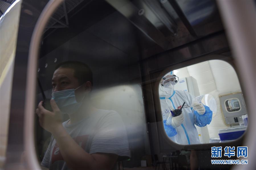 6月22日,气膜舱内的工作人员(右)向舱外的同事汇报舱内机器调试进展。新华社记者彭子洋摄